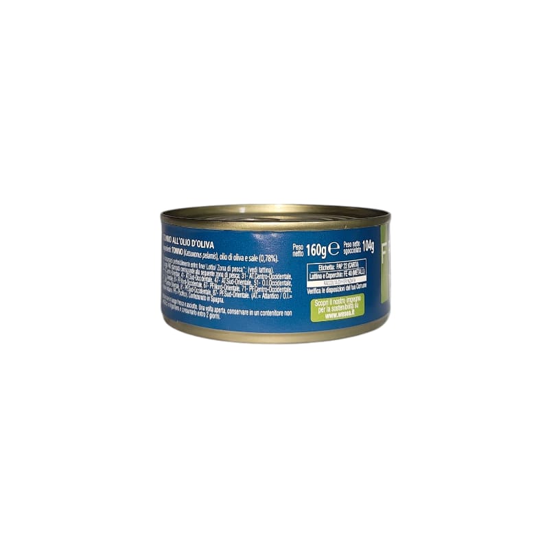 Il Tonno Frontera in Olio di Oliva è un prodotto sostenibile e di qualità, disponibile in lattine da 160 g, con un peso sgocciolato di 104g. È preparato con tonno, olio di oliva e sale. Il marchio si impegna per una pesca responsabile.