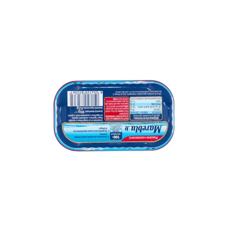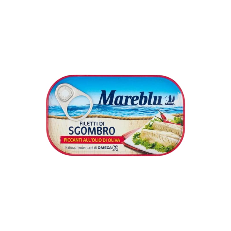 Ingredienti: Filetti di sgombro Olio di oliva Cetriolini (cetriolini, aceto di spirito, sale) (contiene solfiti) Peperoncino in salamoia (3,1%) (peperoncino, acqua, aceto di spirito, sale) Sale Alloro Estratto di peperoncino.