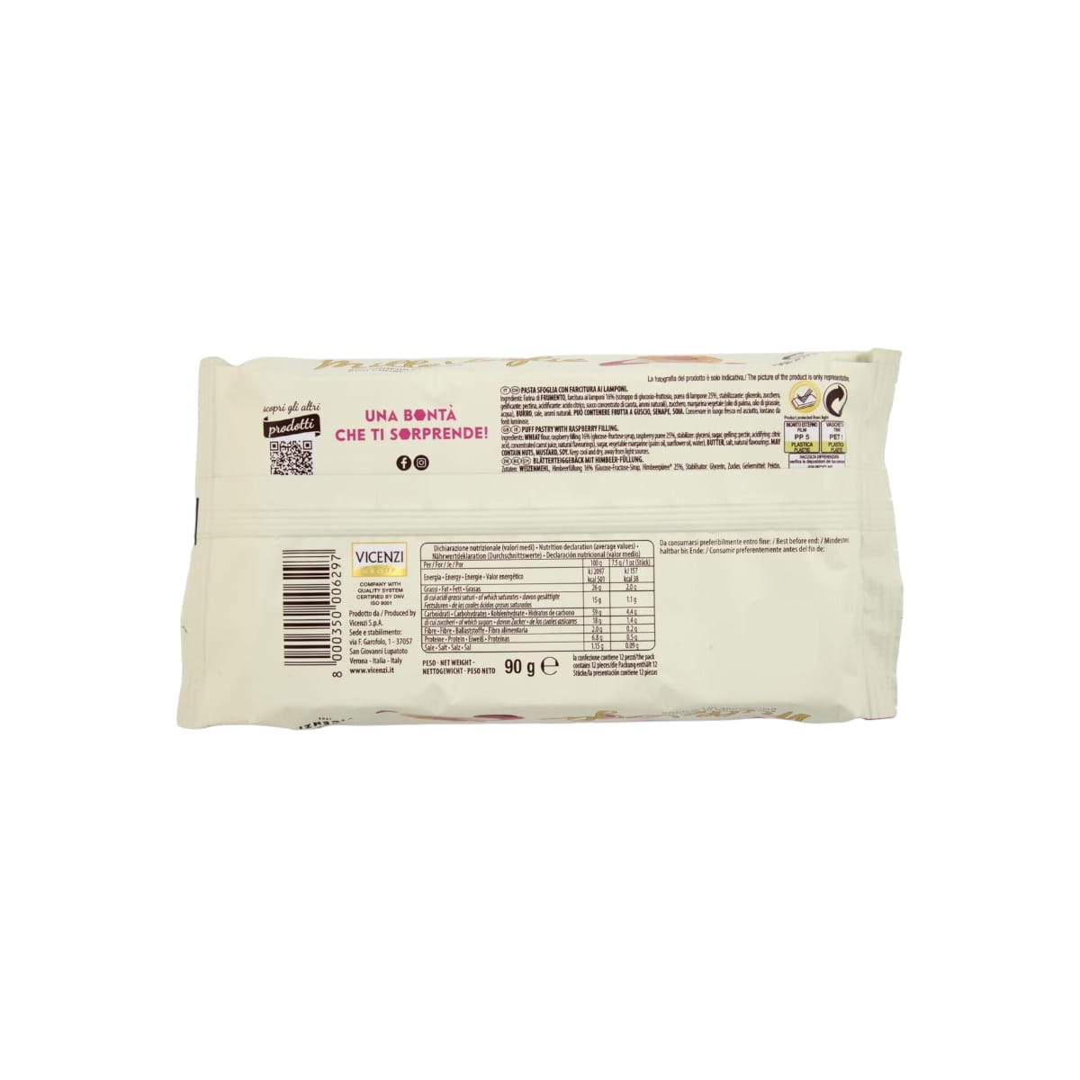 Ingredienti: Farina di FRUMENTO, farcitura ai lamponi 16% (sciroppo di glucosio – fruttosio, purea di lampone 25%, stabilizzante: glicerolo, zucchero, gelificante: pectina, acidificante: acido citrico, succo concentrato di carota, aroma), zucchero, BURRO, margarina vegetale (olio di palma, olio di girasole, acqua), sale, aromi.