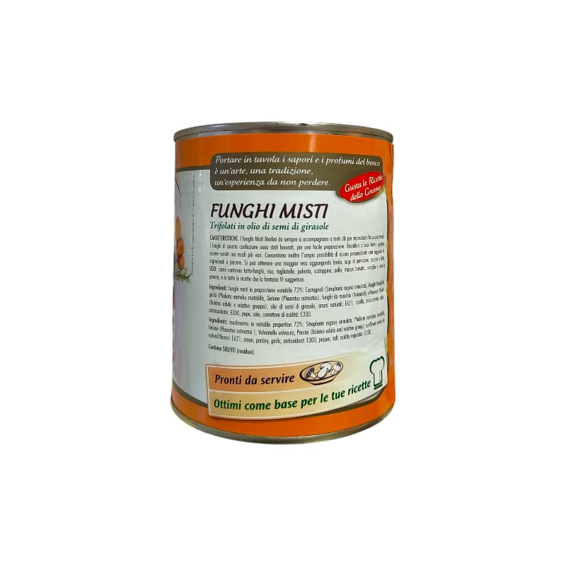 Ingredienti: funghi misti in proporzione variabile 72%: castagnoli , funghi famigliola gialla, gelone, funghi da muschio, porcini; olio di semi di girasole, aromi naturali: E621, cipolla, prezzemolo, aglio, antiossidante: E200, pepe, sale, correttore di acidità: E330
