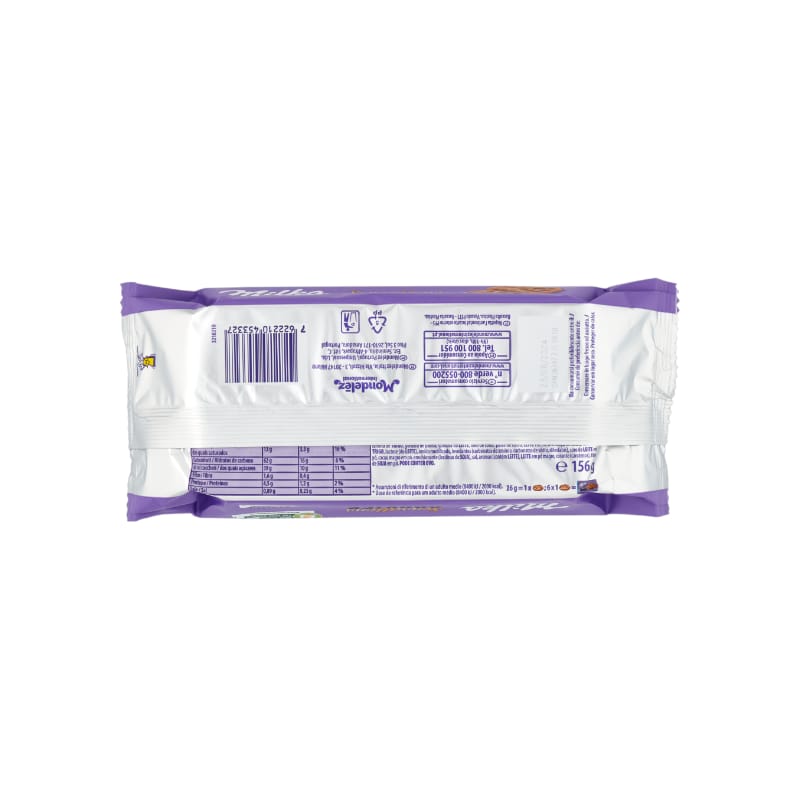 Ingredienti: zucchero, farina di FRUMENTO, olio di palma, grasso del LATTE, olio di colza, pasta di cacao, LATTE intero in polvere, burro di cacao, amido di FRUMENTO, lattosio (da LATTE), amido modificato, agenti lievitanti (carbonati di ammonio, carbonati di sodio, difosfati), siero di LATTE in polvere, cacao magro in polvere, emulsionante (lecitine di SOIA), sodio, aromi (contiene LATTE), LATTE scremato in polvere, colorante (caroteni), fibra di SOIA in polvere.