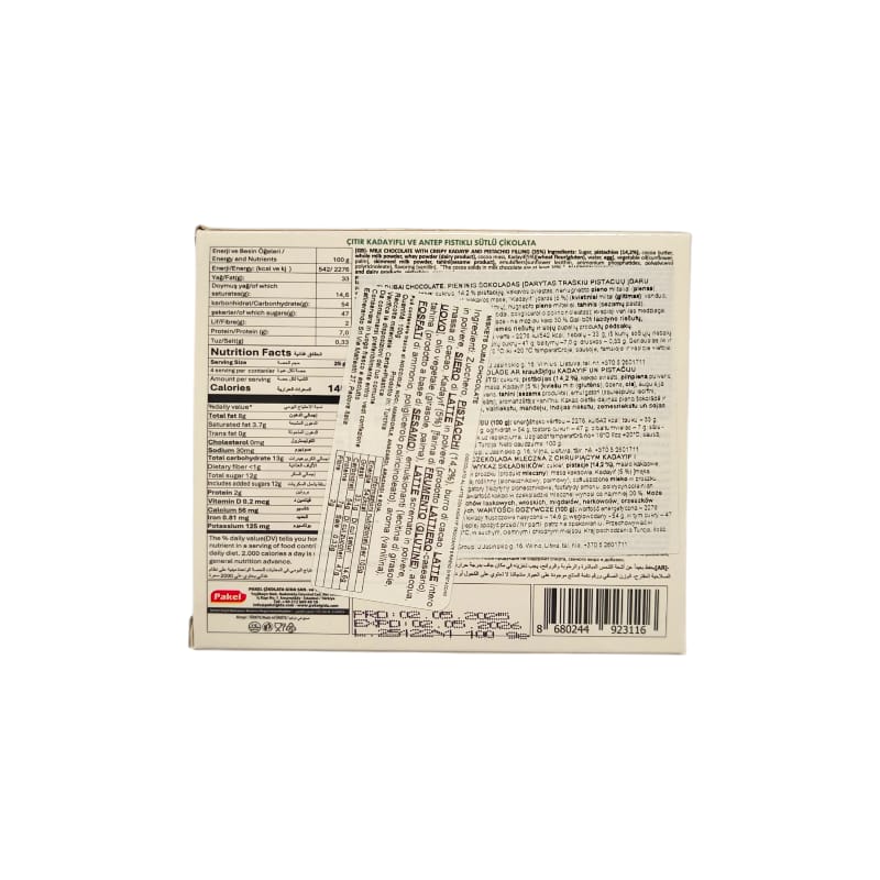 Ingredienti: Zucchero, PISTACCHI (14,2%), burro di cacao, LATTE intero in polvere, SIERO di LATTE in polvere (prodotto LATTIERO-caseario), massa di cacao, Kadayıf (5%) [farina di FRUMENTO (GLUTINE), acqua, UOVO], olio vegetale (girasole, palma), LATTE scremato in polvere, tahina (prodotto a base di SESAMO), emulsionanti (lecitina di girasole, FOSFATI di ammonio, poliglicerolo poliricinoleato), aroma (vanillina).