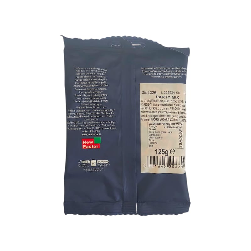 Ingredienti: arachidi tostati e salati, mais tostato salato, semi di zucca sgusciati tostati e salati