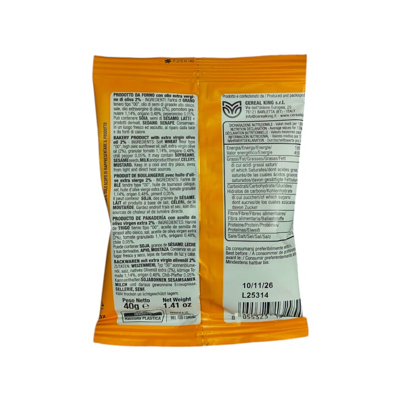 Ingredienti: Farina di GRANO tenero tipo “00”, olio di semi di girasole alto oleico, sale, olio extravergine di oliva (2%), pomodoro granulare 1,14%, origano 0,48%, peperoncino 0,05%.