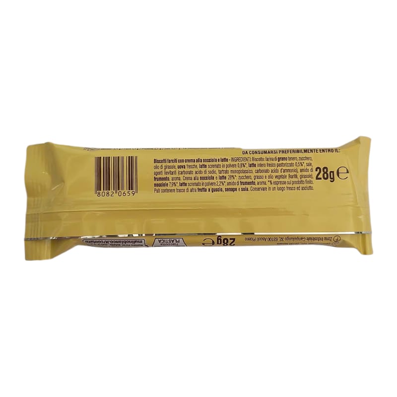Ingredienti: Biscotto: Farina di grano tenero, zucchero, olio di girasole, uova fresche, latte scremato in polvere 0,8%*, latte intero fresco pastorizzato 0,5%*, sale, agenti lievitanti (carbonato acido di sodio, tartrato monopotassico, carbonato acido d’ammonio), amido di frumento, aroma. Crema alla nocciola e latte 28%*: zucchero, grassi ed olio vegetale (karitè, girasole), nocciole 7,9%*, latte scremato in polvere 2,2%*, amido di frumento, aroma. *% espresse sul prodotto finito.