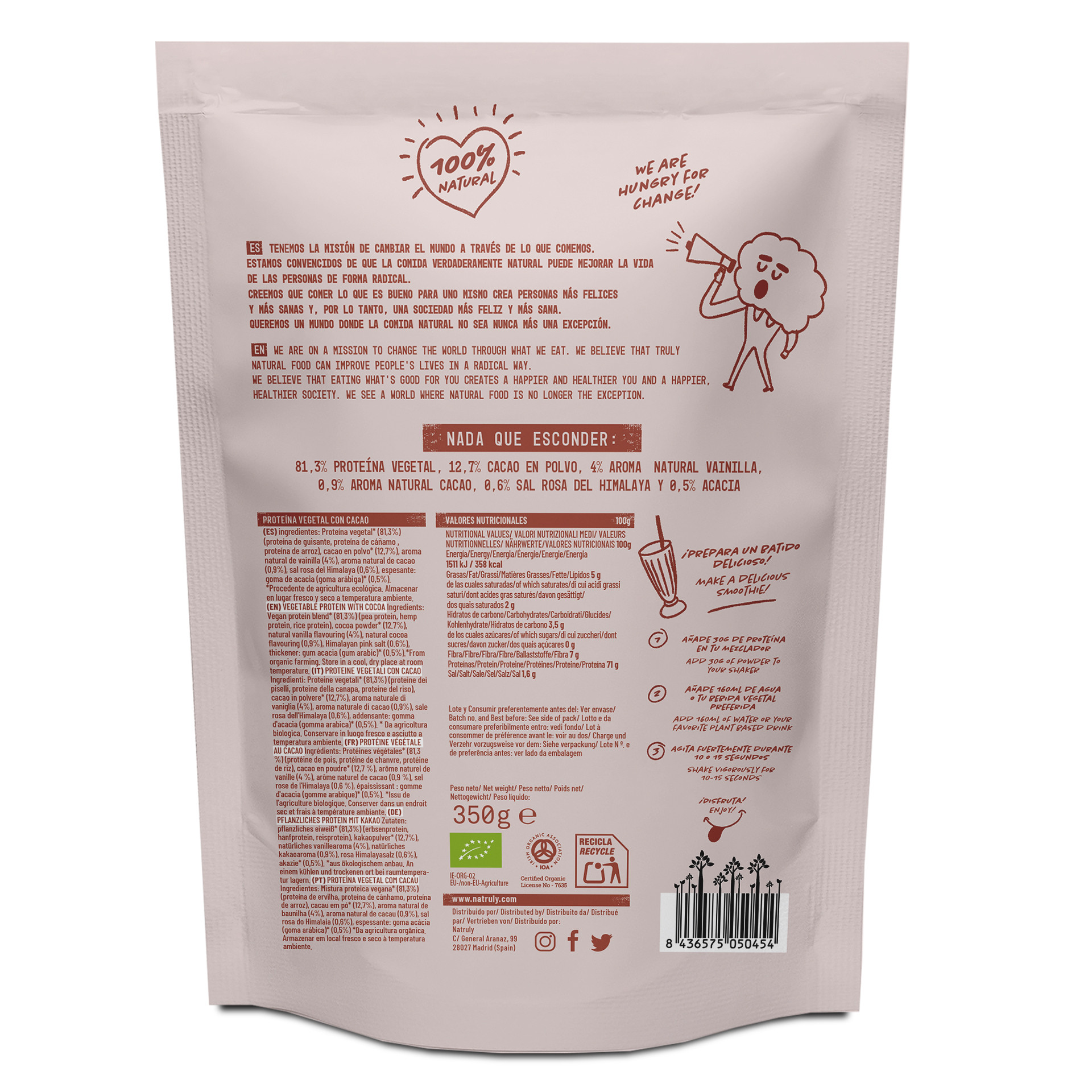 Ingredienti: *proteine vegetali 81,3% (proteine di pisello, proteine di riso, proteine di canapa), *cacao in polvere 12,7%, aroma naturale di vaniglia 4%, aroma naturale di cacao 0,87%, sale rosa dell’Himalaya 0,6%, *gomma di acacia 0,5%. *biologico.
