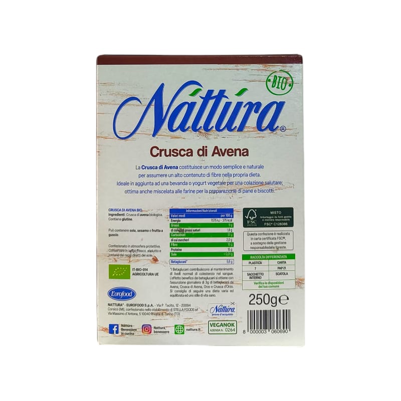 La crusca di avena integrale è la parte esterna del chicco di avena, ricca di fibre e nutrienti. Ha un aspetto leggero e granuloso, con un gusto delicato e naturale. È nota per favorire la digestione, ridurre il colesterolo e aumentare il senso di sazietà. Viene spesso usata per arricchire colazioni, impasti e piatti salutari. In poche parole: è un ingrediente semplice, ma potente, che unisce benessere e versatilità.