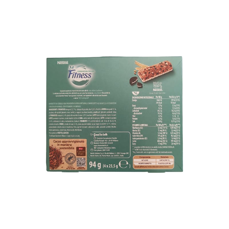Ingredienti: : FRUMENTO integrale 22,7%, sciroppo di glucosio, riso 12,8%, fiocchi di AVENA integrale 9,9%, zucchero, sciroppo di zucchero invertito, umidificanti (glicerolo, sorbitoli), farina di FRUMENTO integrale 5,4%, gocce di cioccolato bianco 3,9% (zucchero, LATTE intero in polvere, burro di cacao, LATTE scremato in polvere, emulsionante lecitine di SOIA, aroma naturale di vaniglia), grasso vegetale (cocco), LATTE scremato in polvere, olio vegetale (girasole), Carbonato di Calcio, maltodestrine, farina di FRUMENTO 1%, aromi naturali, sale, farina di riso 0,3%, estratto di malto d’ORZO, semola di mais 0,3%, burro di cacao, cacao magro in polvere, emulsionante lecitine, melassa, antiossidante estratto ricco di tocoferolo, Ferro, agente lievitante carbonati di sodio, colorante caroteni, Niacina, Acido Pantotenico, Acido Folico, Vitamina B6, Riboflavina.