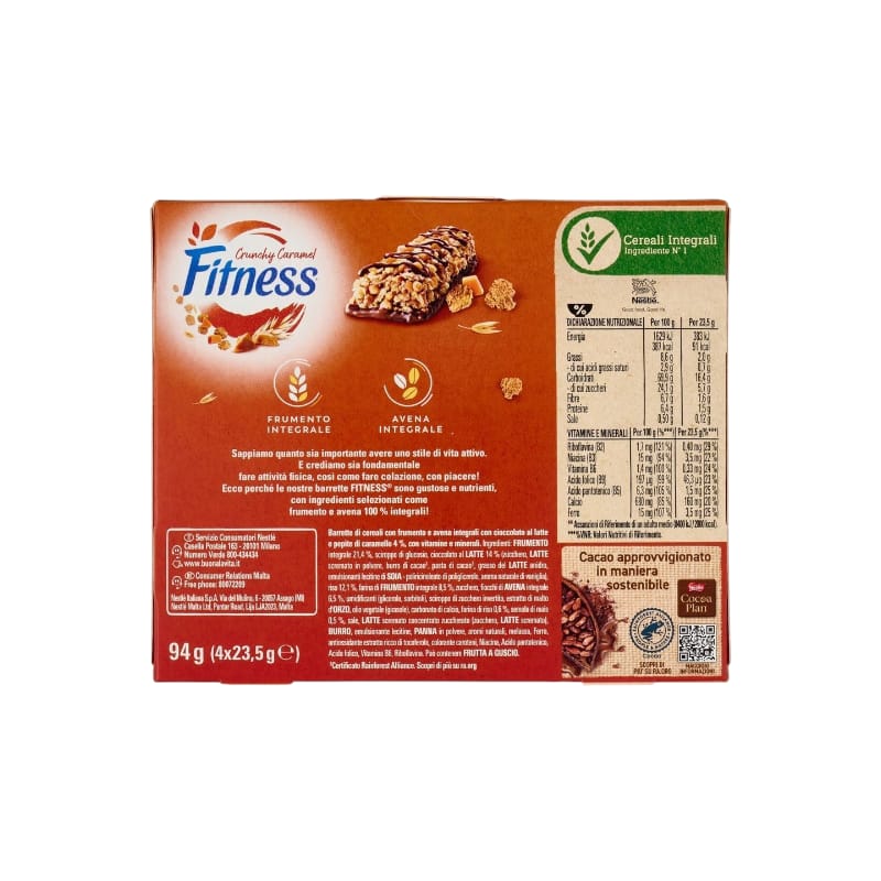 Ingredienti: : Frumento integrale 17,7% Sciroppo di glucosio Cioccolato al latte 14% (zucchero, latte scremato in polvere, burro di cacao, pasta di cacao, grasso del latte anidro, emulsionanti lecitine di soia – poliricinoleato di poliglicerolo, aromi naturali) Riso 12,5% Fiocchi di avena integrale 8,9% Farina di frumento integrale 8,5% Zucchero Umidificanti glicerolo – sciroppo di sorbitolo Sciroppo di zucchero invertito Malto d’orzo Olio vegetale (girasole) Carbonato di calcio Farina di riso 0,6% Sale Estratto di malto d’orzo (orzo, malto d’orzo) Semola di mais 0,5% Latte concentrato zuccherato (latte, zucchero)