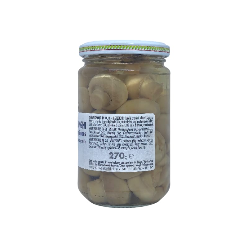 Ingredienti: funghi prataioli coltivati 65%, olio di semi di girasole 34%, aceto di vino, sale, esaltatore si sapidità E621, antiossidante E300, correttore di acidità E330, succo di limone, aromi naturali.