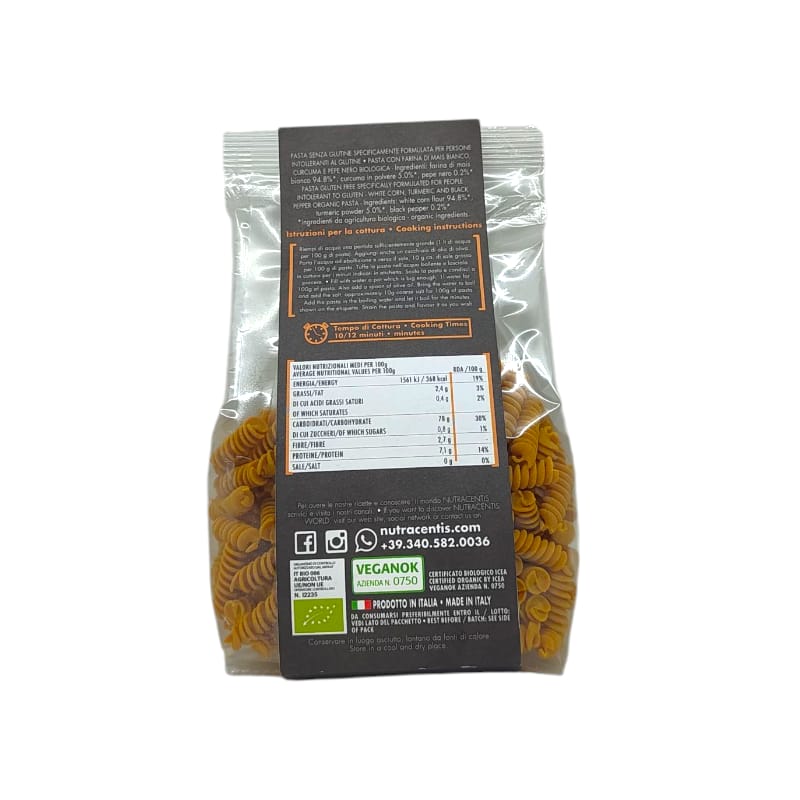 Pasta senza glutine, realizzata con mais bianco italiano e arricchita con curcuma e pepe nero per un gusto delicatamente speziato e un colore dorato naturale. Leggeri, digeribili e con buona tenuta in cottura, offrono un’alternativa nutriente e originale alla pasta tradizionale, ideali con condimenti semplici a base di verdure o pesce. Prodotto in Italia.
