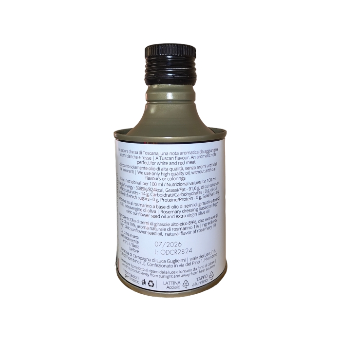 Ingredienti: olio di semi di girasole altoleico 89%, olio extra vergine di oliva 10%, aroma naturale di rosmarino 1%