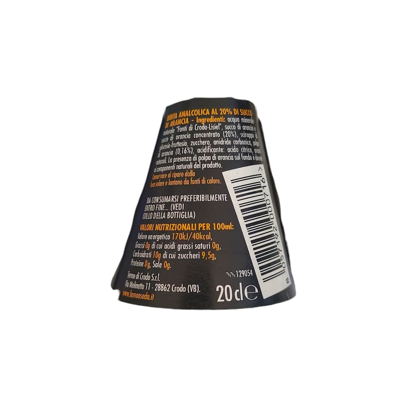 Ingredienti: Acqua minerale naturale “Fonti di Crodo-Lisiel” Succo di arancia e succo di arancia da concentrato (20%) Sciroppo di glucosio-fruttosio Zucchero Anidride carbonica Polpa di arancia (0,16%) Acidificante: acido citrico Aromi naturali