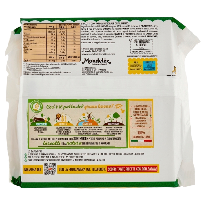 Oro Saiwa 5 Cereali da 420g è un biscotto integrale ricco di fibre e magnesio, preparato con il 100% di grano italiano e una miscela di cinque cereali: frumento, riso, orzo, avena e segale. È pensato per offrire una colazione gustosa e nutriente, ideale per chi cerca benessere e genuinità.