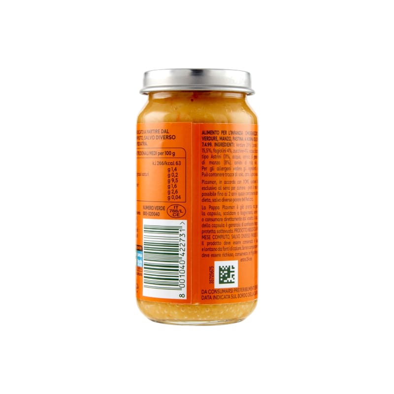 Ingredienti: Verdure (39%) (Carote 15,5%, Patate 15,5%, Fagiolini 4%, Zucchine 4%), Acqua Di Cottura, Pastina Per Infanzia Plasmon Tipo Astrini (11%) (Semola Di Grano Duro), Carne Di Manzo (8%), Amido Di Mais, Olio Di Girasole.