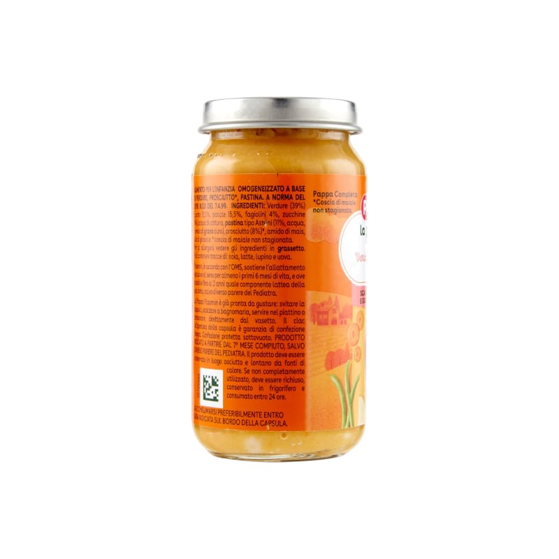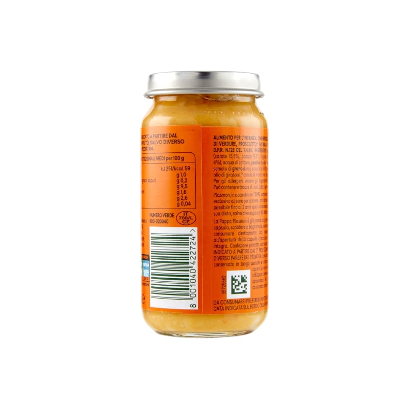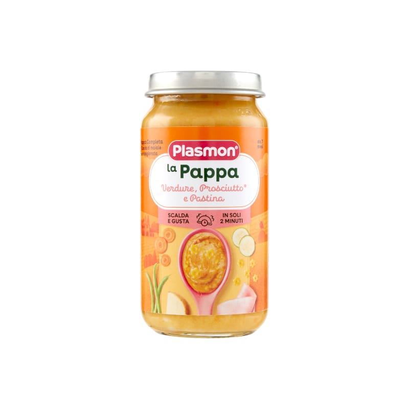 Plasmon La Pappa Verdure, Prosciutto e Pastina 200g è un alimento completo per l’infanzia, pensato per i bambini a partire dal 7° mese. È una pappa pronta che unisce verdure selezionate, prosciutto e pastina per offrire un pasto nutriente, bilanciato e facile da digerire.