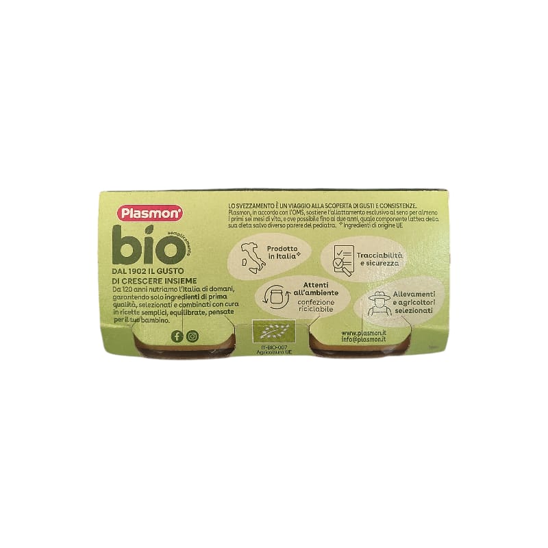 Plasmon Bio Tacchino con Patate Dolci è un omogeneizzato biologico pensato per accompagnare i primi passi dello svezzamento, a partire dal 6° mese. La sua ricetta semplice e naturale unisce la delicatezza delle patate dolci alla ricchezza nutrizionale della carne di tacchino, offrendo un pasto equilibrato, gustoso e facilmente digeribile. Preparato con ingredienti 100% biologici e selezionati con cura, contiene solo patate dolci, carne di tacchino, acqua di cottura e farina di riso, senza sale aggiunto, glutine, amidi, coloranti o conservanti.