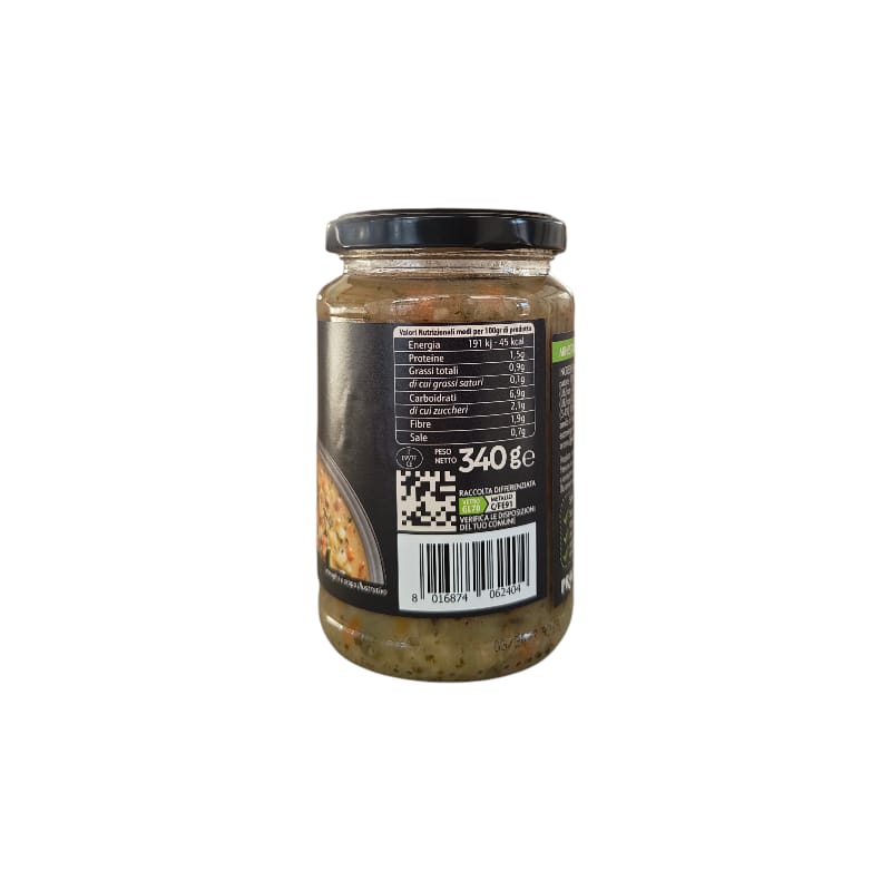 Ingredienti: acqua, carote, patate, zucchine, fagioli borlotti, sedano, cipolle, cavolfiore, porro,amido di riso, spinaci, sale, olio evo, prezzemolo, aglio, pepe nero, aroma.