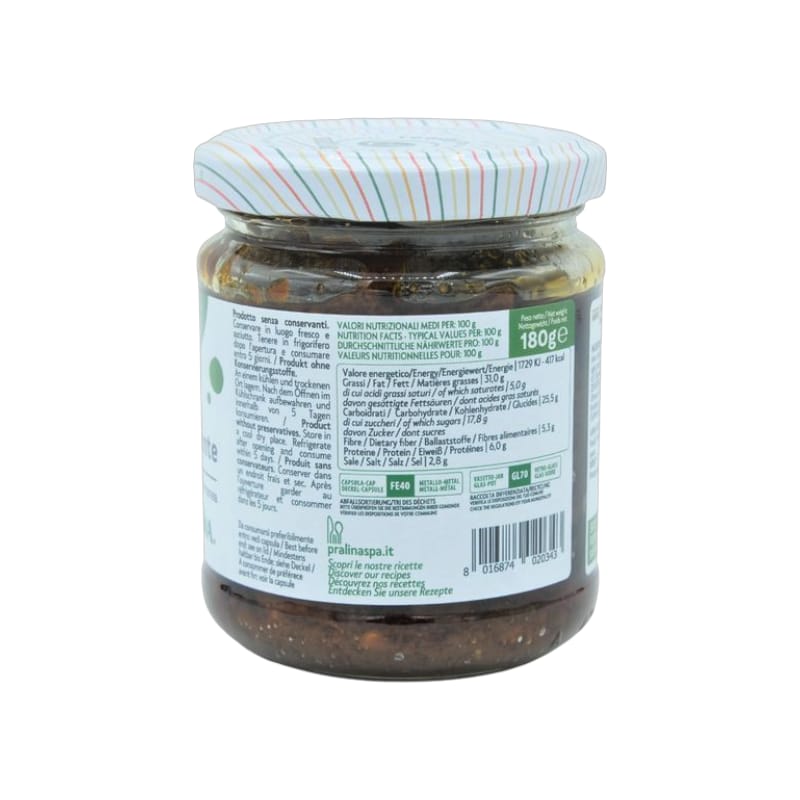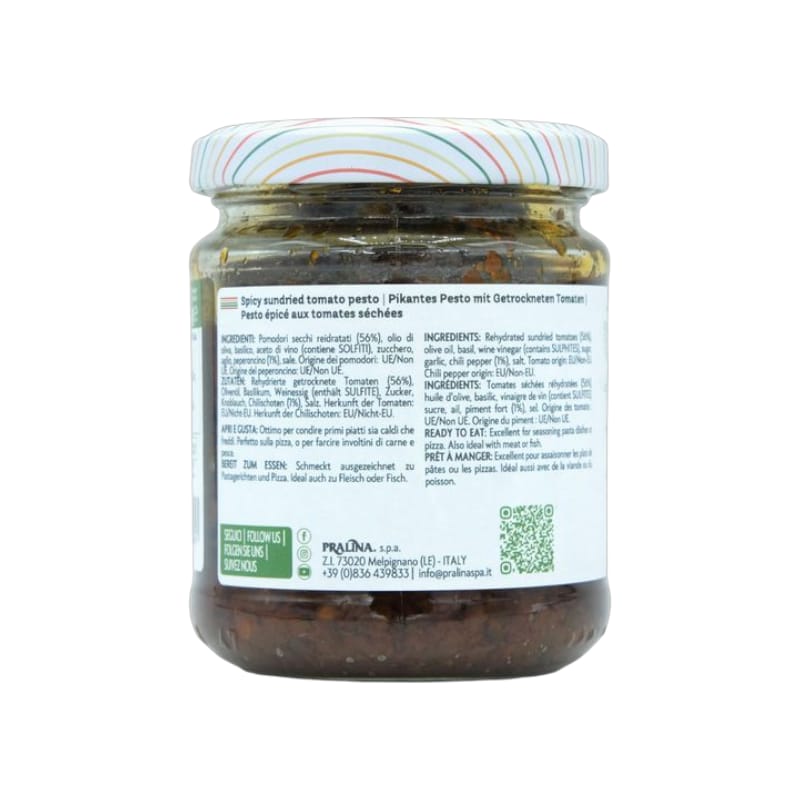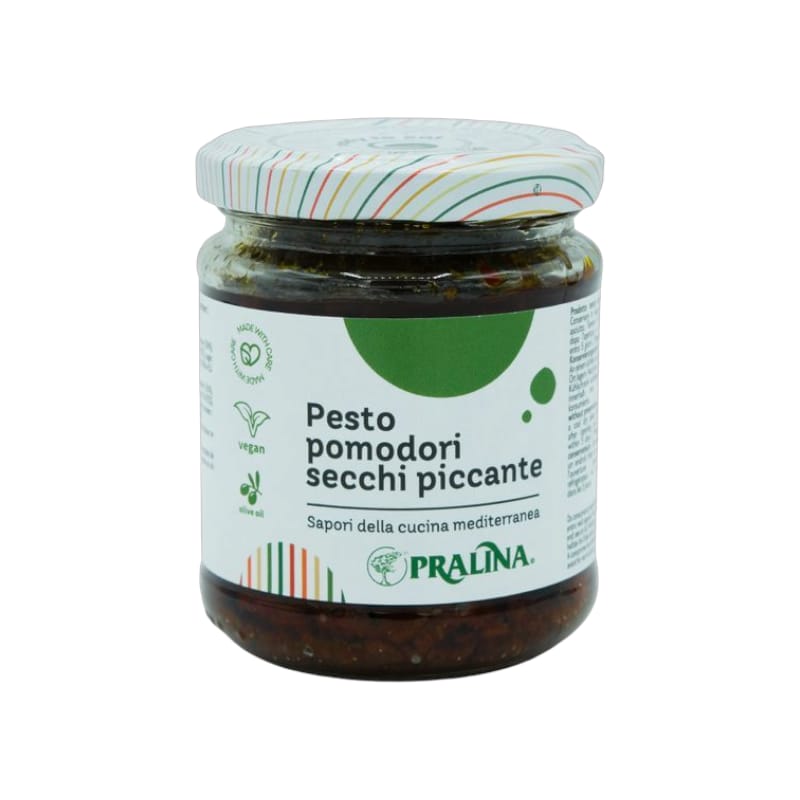 Il Pesto di Pomodori Secchi Piccante è un condimento dal sapore deciso, speziato e intenso , con una consistenza morbida e granulosa , perfetto per dare un tocco di carattere ai tuoi piatti. Adatto a diete vegetariane e vegane , si presta a molteplici utilizzi in cucina: ideale per secondi piatti di carne , pronto in pochi minuti per condire pasta e riso , preferibilmente spaghetti, e perfetto per arricchire crostini, tartine e panini farciti con un gusto unico e stuzzicante. La sua intensità si esalta anche sulla pizza , regalando una nota vivace che conquista il palato. Un vero must per gli amanti dei sapori forti e autentici!