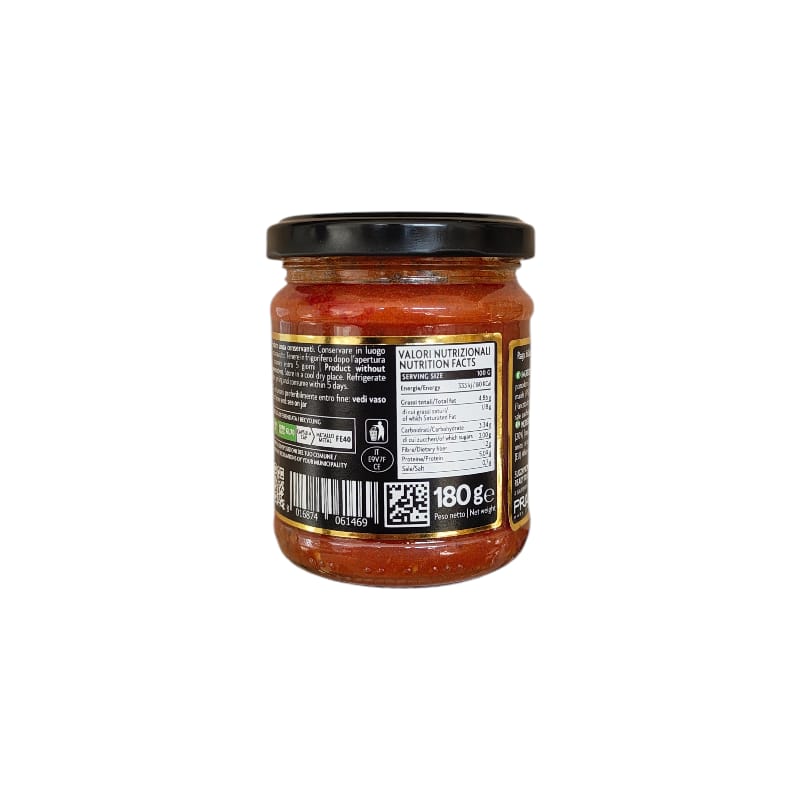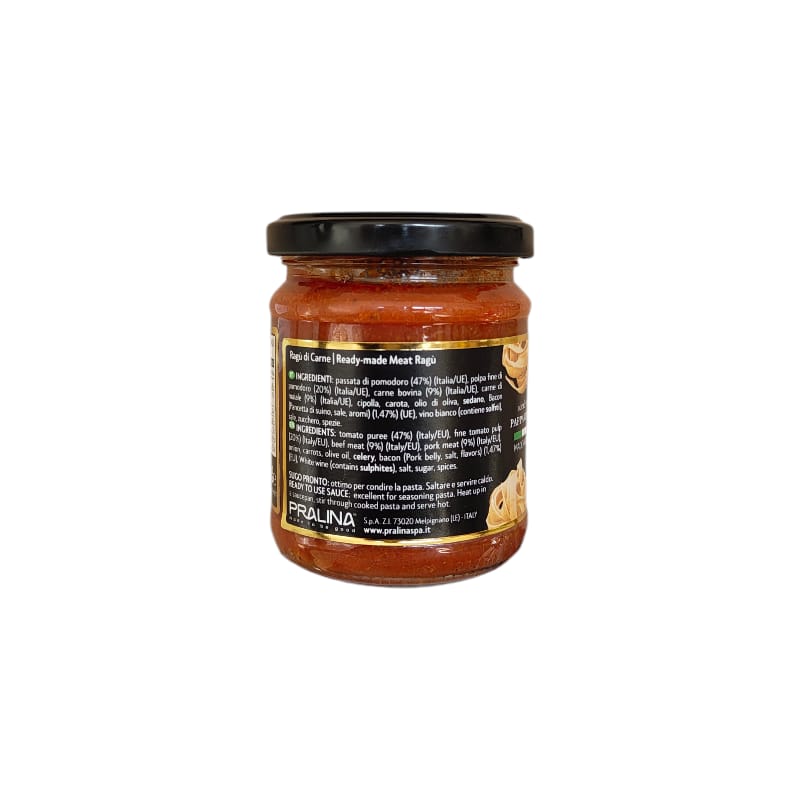 Ingredienti: Passata di pomodoro, polpa fine di pomodoro, carne bovina, carne di maiale, cipolla, carote, olio di oliva, sedano, bacon (pancetta di suino, sale, aromi), vino bianco (contiene solfiti), sale, zucchero, spezie