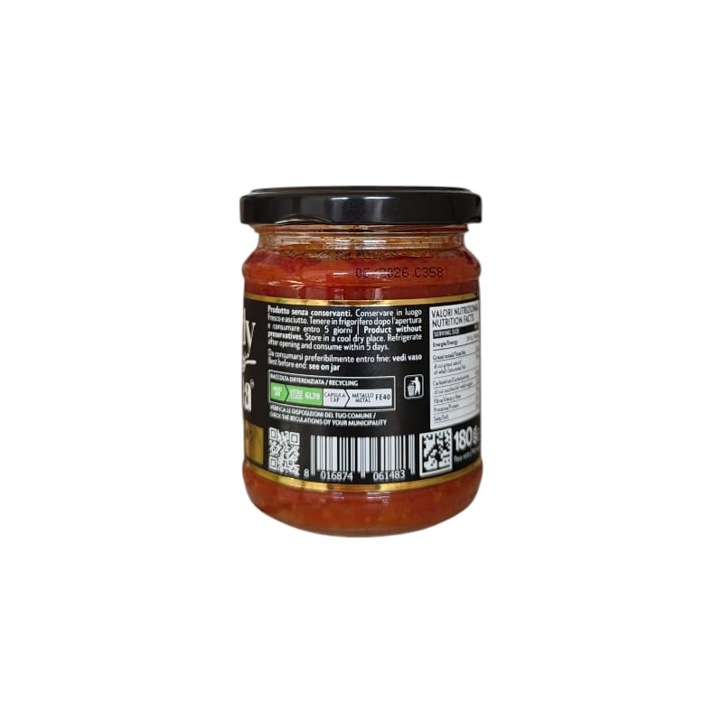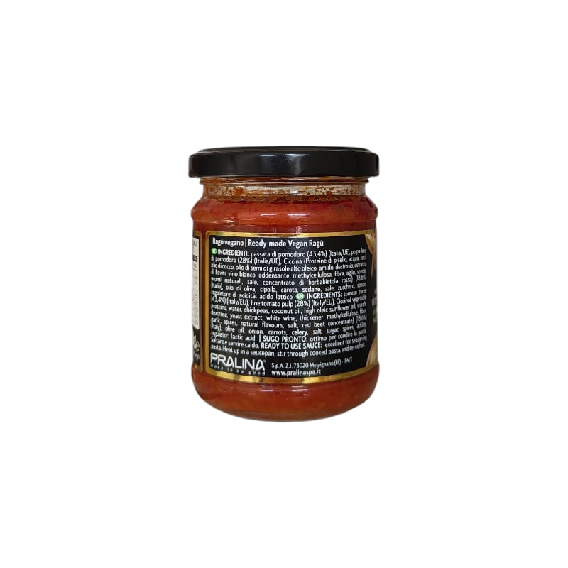 Ingredienti: Passata di pomodoro, polpa fine di pomodoro, Ciccina (proteine di pisello, acqua, ceci, olio di cocco, olio di semi di girasole alto oleico, amido, destrosio, estratto di lieviti, vino bianco, addensante: methylcellulosa, fibra, aglio, spezie, aromi naturali, sale, concentrato di barbabietola rossa), olio di oliva, cipolla, carota, sedano, sale, zucchero, spezie, regolatore di acidit: acido lattico