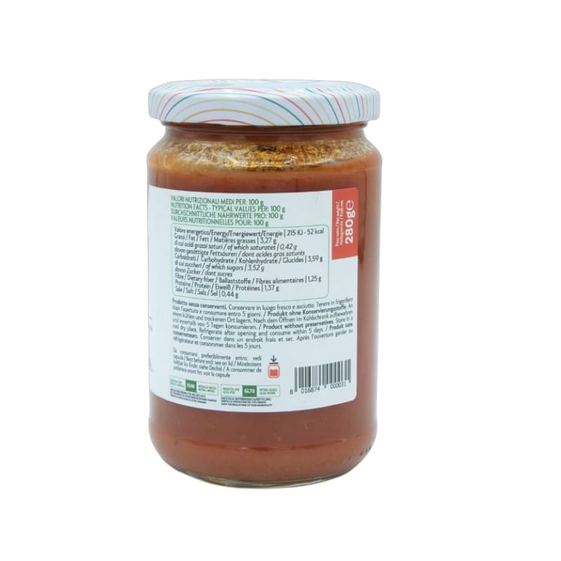 Ingredienti: Polpa di pomodoro, olio extra vergine di oliva, funghi champignon, olive verdi, peperoni, capperi, pasta di acciughe (acciughe salate 95%, olio di oliva), aglio, prezzemolo, sale.