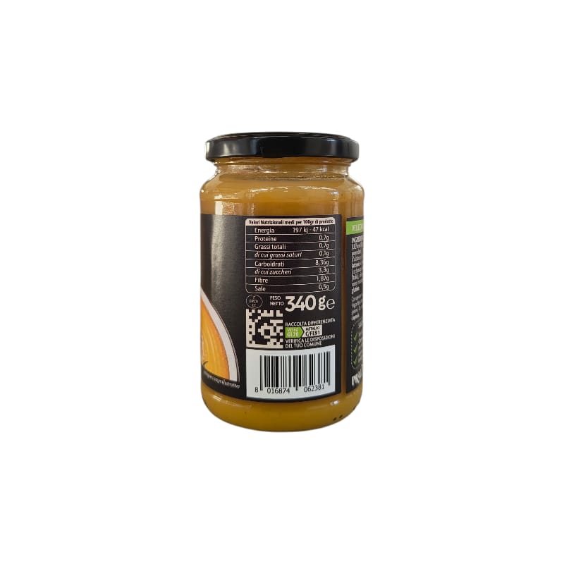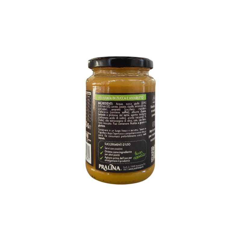 Ingredienti: acqua, zucca, gialla, carote, patate, cipolle, amido di riso, pomodori, amaretti zucchero, mandorle d’albicocca-contiene solfiti-, albume d’uovo, lattosio e proteine del latte, agente lievitante -carbonato acido di sodio-, aroma naturale), olio evo, sale, zucchero, noce moscata.