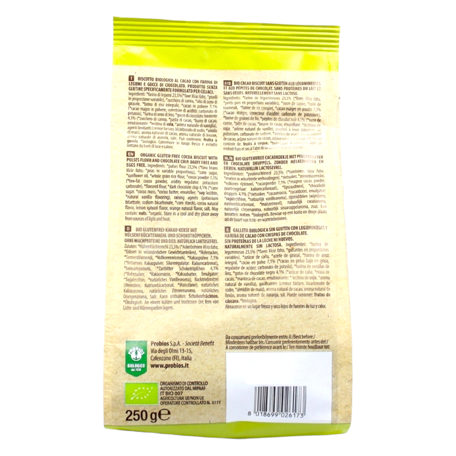 I Bis-Free Dark con Legumi e Gocce di Cioccolato Probios sono biscotti biologici al cacao, perfetti per iniziare la giornata con energia o concedersi una pausa golosa. Preparati senza glutine, lattosio, proteine del latte né uova, sono ideali anche per chi segue diete specifiche. La loro ricetta unisce farina di legumi (fave e piselli in proporzione variabile) e farina di riso, rendendoli una gustosa fonte di proteine vegetali. Un’alternativa sana e deliziosa per tutta la famiglia.