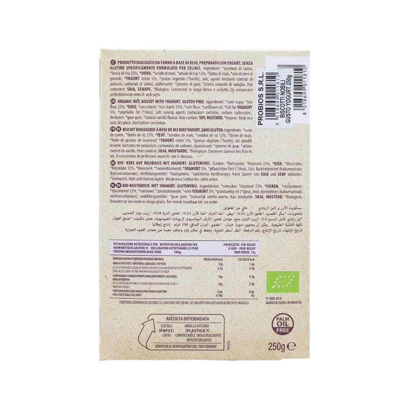 Ingredienti:*zucchero di canna, *farina di riso 23%, *UOVA, *amido di mais, *amido di riso 12%, *farina di mais, *olio di semi di girasole, *YOGURT intero 5%, *olio di karitè, sale, agenti lievitanti (tartrati di potassio, carbonati di sodio), addensante: *gomma di guar, *aroma naturale di vaniglia. *biologico.