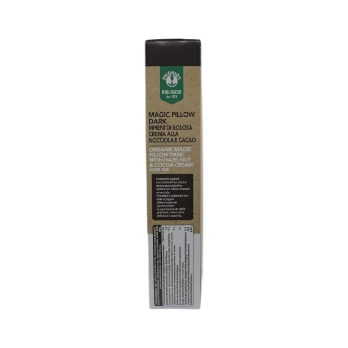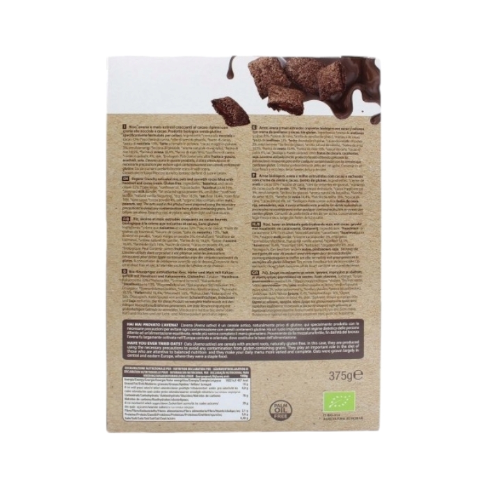 Ingredienti: *crema alla NOCCIOLA e cacao 32% (*zucchero di canna, *olio di semi di girasole, *burro di cacao, *pasta di NOCCIOLE 13%, *LATTE scremato in polvere, *cacao in polvere 3%, emulsionante: *lecitina di girasole, *estratto di vaniglia), *farina di riso 18,5%, *farina di AVENA 16,4%, *farina di mais 16%, *zucchero di canna, *cacao in polvere 4%, sale. *biologico.