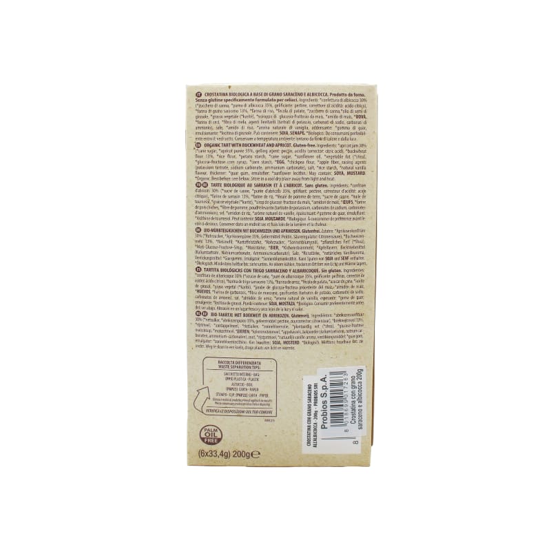 Ingredienti: *confettura di albicocca 30% (*zucchero di canna, *purea di albicocca 35%, gelificante: pectine, correttore di acidità: acido citrico), *farina di grano saraceno 13%, *farina di riso, *fecola di patate, *zucchero di canna,*olio di semi di girasole, *sciroppo di glucosio-fruttosio da mais, *amido di mais, *UOVA, *farina di ceci, *fibra di mela, agenti lievitanti (tartrati di potassio, carbonati di sodio, carbonati di ammonio), sale, *amido di riso, *aroma naturale di vaniglia, addensante: *gomma di guar. *biologico.