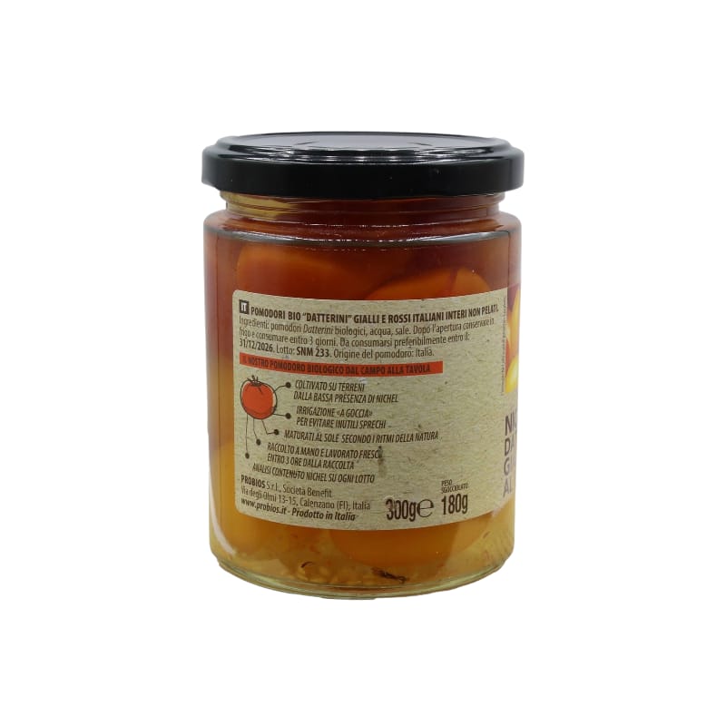 I Datterini Interi Rossi e Gialli al Naturale Nickel Free di Probios rappresentano una proposta gustosa e colorata per arricchire ogni piatto con un tocco di vivacità e sapore. Questa specialità biologica 100% italiana è ottenuta da pomodori coltivati su terreni a basso contenuto di nichel e lavorati con attenzione per preservarne la qualità. La presenza di nichel è inferiore a 0,03 mg/kg, come attestato da rigorosi controlli e analisi condotti da un ente certificatore, a garanzia di un prodotto sicuro e adatto anche a chi ha esigenze alimentari specifiche.