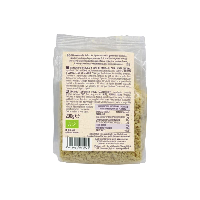 Sostituto d’eccellenza per la carne, il Granulare di Soia Probios garantisce una consistenza perfetta in ogni preparazione. Specificamente formulato per la dieta gluten-free, rappresenta una fonte eccellente di proteine e fibre. La scelta ideale per realizzare polpettoni, burger e sughi vegetali mantenendo un profilo nutrizionale bilanciato e un sapore autentico.