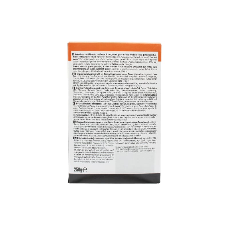 Ingredienti: *fiocchi di SOIA, *sciroppo di riso (*farina di riso, acqua), *fiocchi di AVENA, *semi di girasole, *riso soffiato,*sciroppo d’ agave, *proteine di riso, *cocco in scaglie, *cacao in polvere 2,5% (*cacao magro in polvere, correttore di acidità: carbonato di potassio), *aroma naturale di arancia 0,5%, sale, antiossidanti: *estratto di rosmarino. *Biologico.