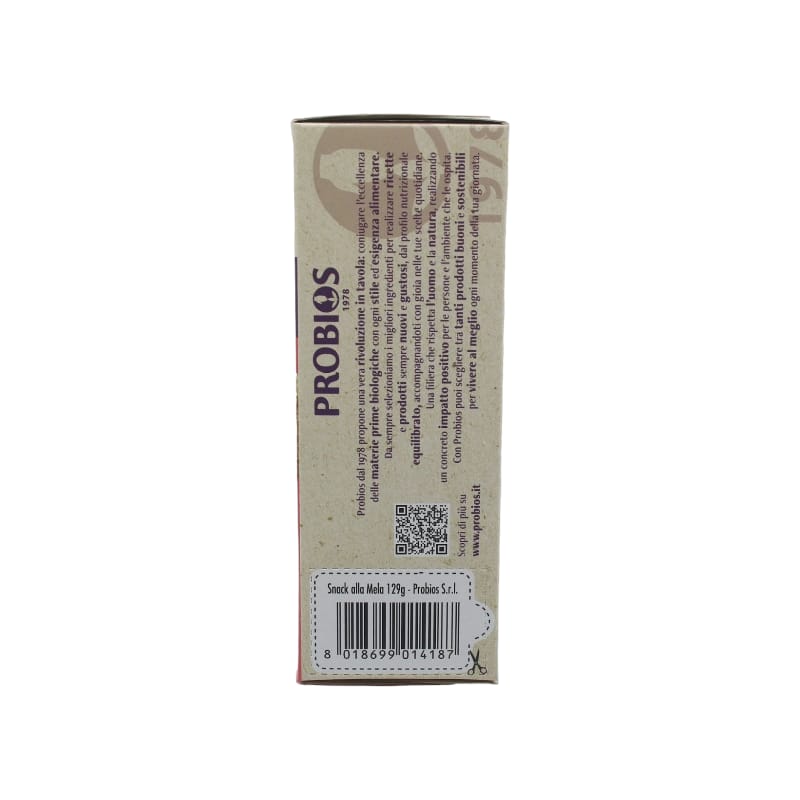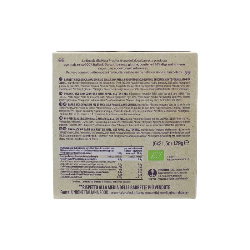 Lo Snack alla Mela Probios è una gustosa barretta realizzata con mais e riso di origine 100% italiana. Naturalmente senza glutine, offre un’alternativa leggera e sana, con il 65% di grassi in meno rispetto alla media dei prodotti simili sul mercato.