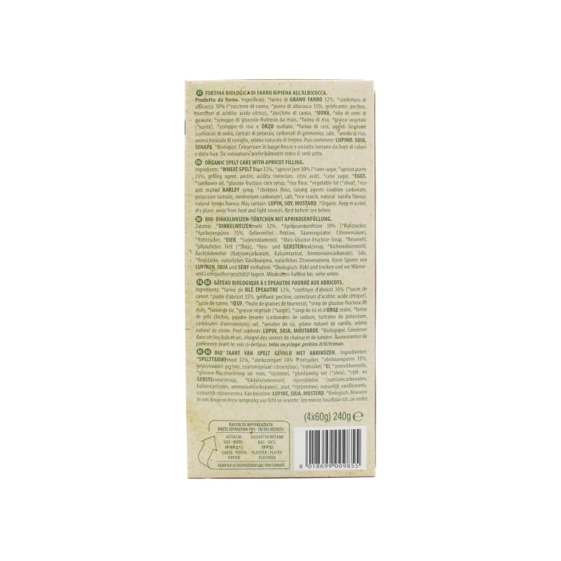 Ingredienti: *farina di GRANO FARRO 32%, *confettura dialbicocca 30% (*zucchero di canna, *purea di albicocca 35%, gelicante: pectine,correttori di acidità: acido citrico), *zucchero di canna, *UOVA, *olio di semi di girasole, *sciroppo di glucosio-fruttosio da mais, *farina di riso, *grasso vegetale(*karitè), *sciroppo di riso e ORZO maltato, *farina di ceci, agenti lievitanti(carbonati di sodio, tartrati di potassio, carbonati di ammonio), sale, *amido di riso,aroma naturale di vaniglia, aroma naturale di limone. *biologico.