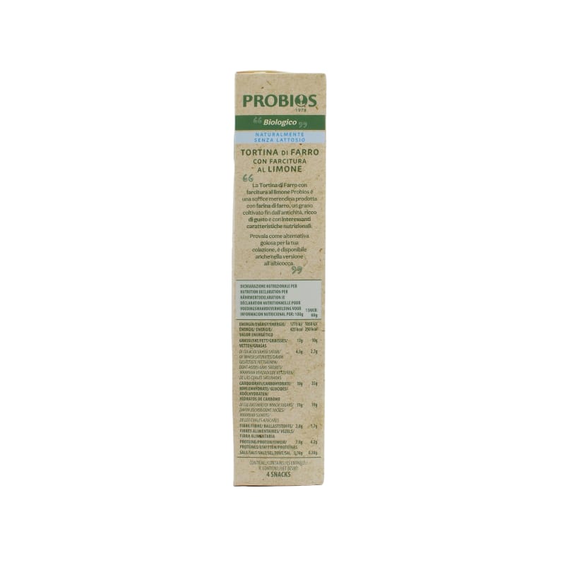 Ingredienti: *farina di grano FARRO 32%, preparato di frutta con limone 30% (*sciroppo di glucosio-fruttosio da mais, *succo di limone 30%, gelificante: pectina, *amido di mais, aroma naturale di limone), *zucchero di canna, *UOVA, *olio di semi di girasole, *sciroppo di glucosio-fruttosio da mais, *farina di riso, *olio di karité, *sciroppo di riso e ORZO maltato, *farina di ceci, agenti lievitanti (carbonati di sodio, tartrati di potassio, carbonati di ammonio), sale, aroma naturale di vaniglia, aroma naturale di limone. *biologico.