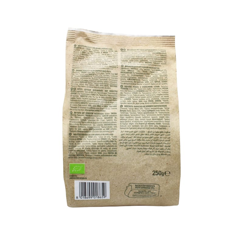 Ingredienti: *farina di GRANO 26%, *zucchero di canna, *farina integrale di AVENA 12%, *farina integrale di ORZO 12%, *farina di riso, *olio di semi di girasole, *granella di NOCCIOLE 5%, *sciroppo concentrato di datteri, *olio di karité, *riso germogliato, addensante: *gomma arabica, agenti lievitanti (carbonati di ammonio, tartrati di potassio, carbonati di sodio), sale, aroma naturale di NOCCIOLA, *aroma naturale di vaniglia, antiossidante: *estratti di rosmarino. *biologico.