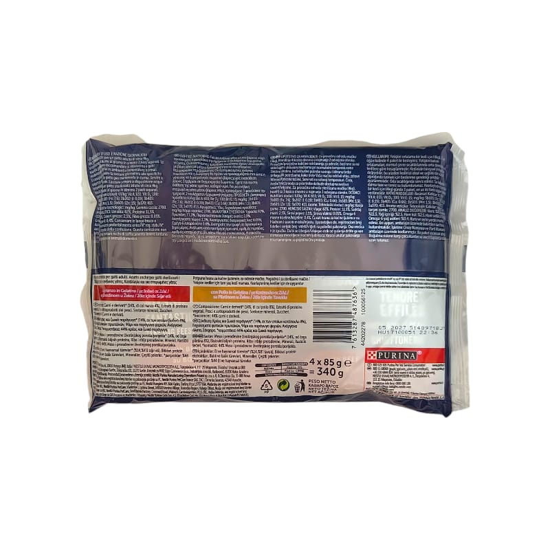 Cibo umido per gatti adulti, composto da 4 bustine (2 al manzo e 2 al pollo), con bocconcini in gelatina gustosi e nutrienti.