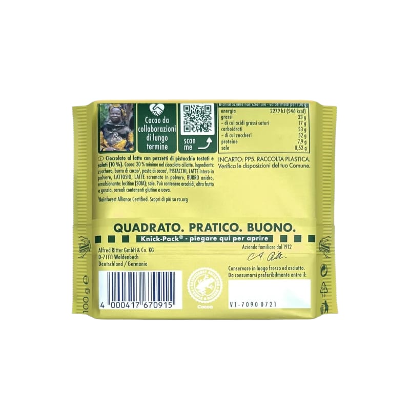Ingredienti: zucchero, burro di cacao, pasta di cacao, PISTACCHI, LATTE intero in polvere, LATTOSIO, LATTE scremato in polvere, BURRO anidro, emulsionante: lecitine (SOIA), sale.