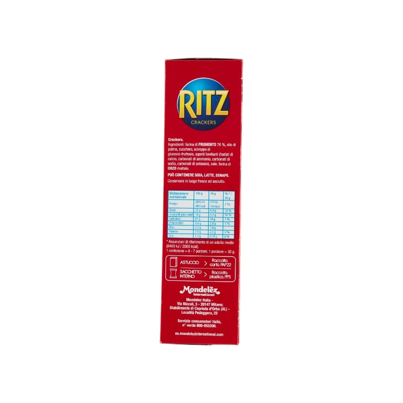 Ingredienti: farina di frumento, olio di girasole, sale, agenti lievitanti (fosfati di calcio, carbonati di ammonio, carbonati di sodio, carbonati di potassio), zucchero, sciroppo di glucosio-fruttosio, farina di orzo maltato.