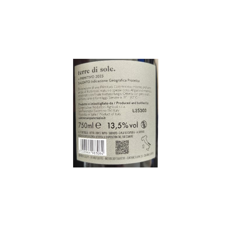 Il Terre di Sole Primitivo è l’espressione solare e generosa della Cantina San Pancrazio. Questo vino celebra uno dei vitigni più iconici della Puglia, offrendo un’esperienza sensoriale che racchiude tutta la ricchezza e la morbidezza tipiche delle uve maturate sotto il sole del Salento.