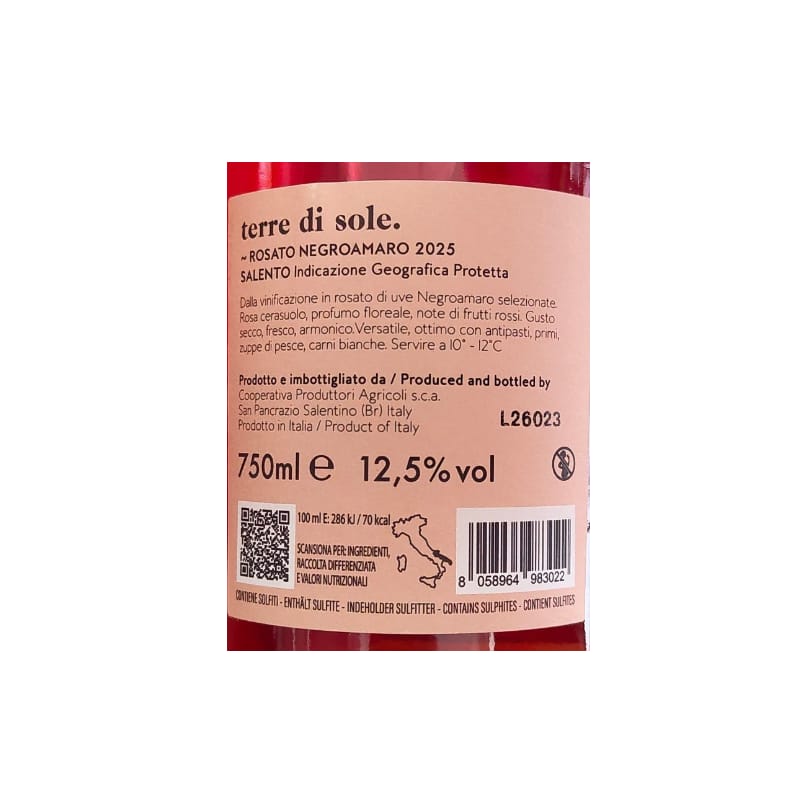 Terre di Sole Rosato Negroamaro Salento IGP (12,5% vol) è un omaggio alla tradizione salentina della Cantina San Pancrazio, che valorizza questo vitigno simbolo con una vinificazione in rosa volta a esaltarne la freschezza e la vivacità. Ecco le caratteristiche principali:
