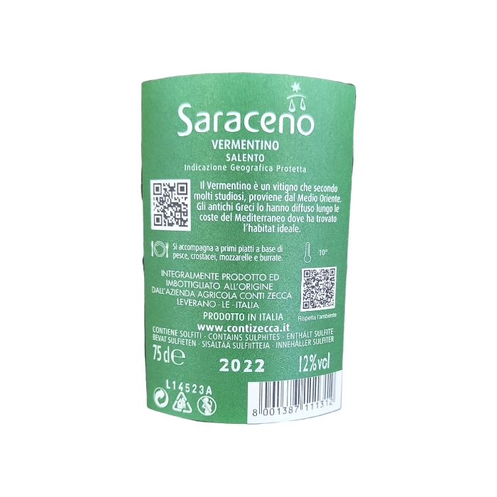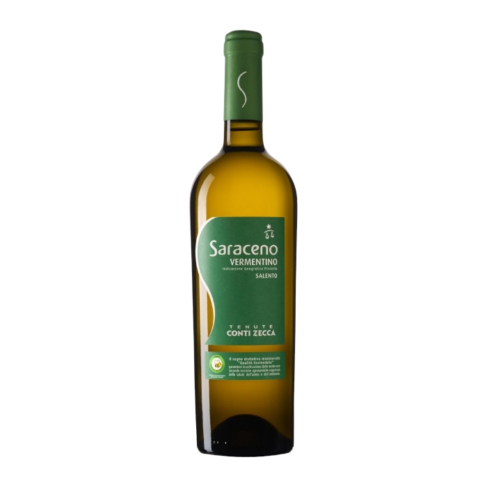 Vermentino I.G.P. Salento dal colore Giallo paglierino con riflessi verdolini dal sapore vivace in fragranza fruttata, piacevolmente sapido. Si accompagna a primi piatti a base di pesce, crostacei, mozzarelle e burrate. 12% vol.