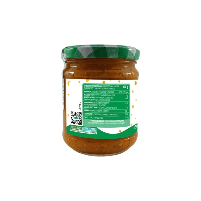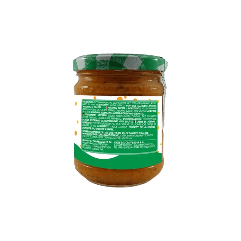 Ingredienti: zucca gialla (84,7%), olio di oliva, sale, pepe nero, origano, aglio, aceto di vino, acidificante: acido citrico