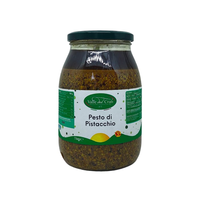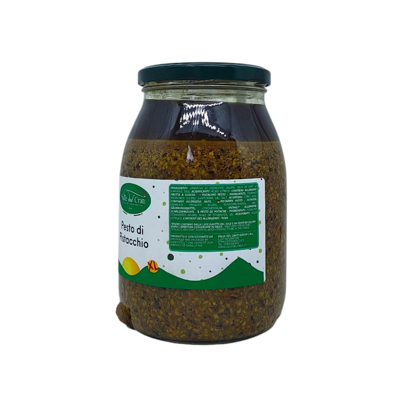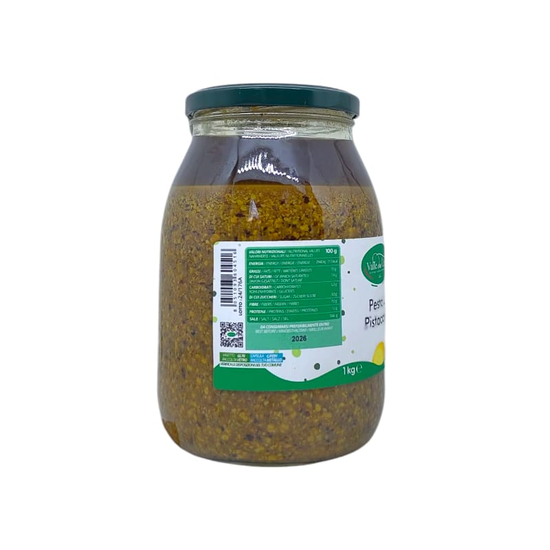 Deliziosamente cremoso e leggermente croccante, questo pesto di pistacchio è un trionfo di sapori e consistenze. Preparato con granella di pistacchio per dare quel tocco rustico e gourmet, si amalgama perfettamente con l’olio di semi di girasole, leggero e neutro, che esalta il gusto del pistacchio senza sovrastarlo. Un pizzico di sale bilancia la dolcezza naturale del frutto e ne valorizza l’intensità.