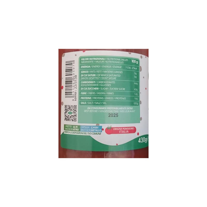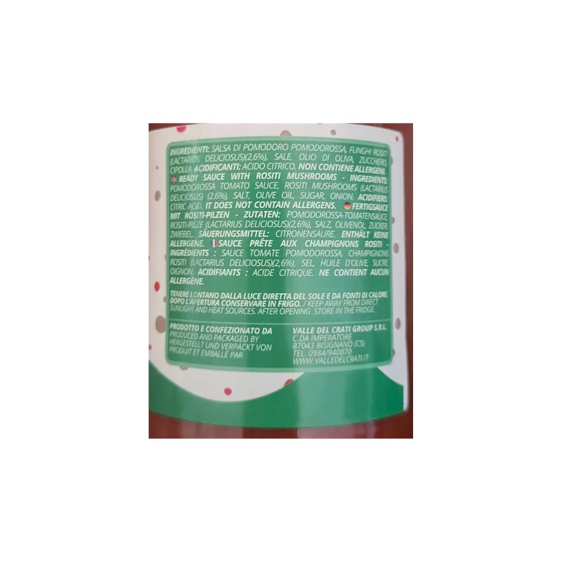 Ingredienti: Salsa di pomodoro PomodoRossa, funghi rositi (lactarius deliciosus) (2,6%), sale, olio di oliva, zucchero, cipolla.. Acidificante: Acido citrico.