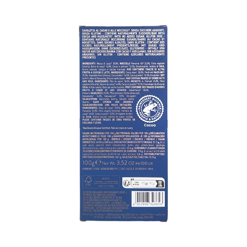 Ingredienti: Massa di cacao 30.0%, NOCCIOLA Piemonte IGP 25.0%, Fibra vegetale (cicoria), Burro di cacao 16.0%, Cacao in polvere 10.5%, Emulsionante: lecitina di SOIA, Aroma naturale, Vaniglia in bacche macinata.