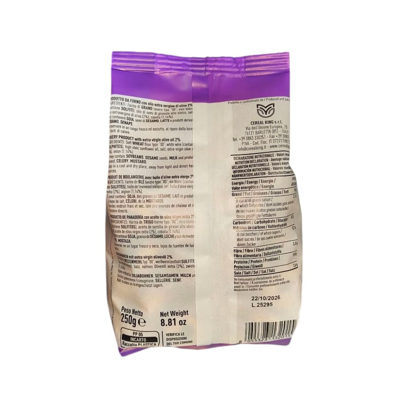 Ingredienti: Farina di GRANO tenero, vino bianco (contiene solfiti), olio di semi di girasole alto oleico, sale, olio extra vergine di oliva, cipolla.