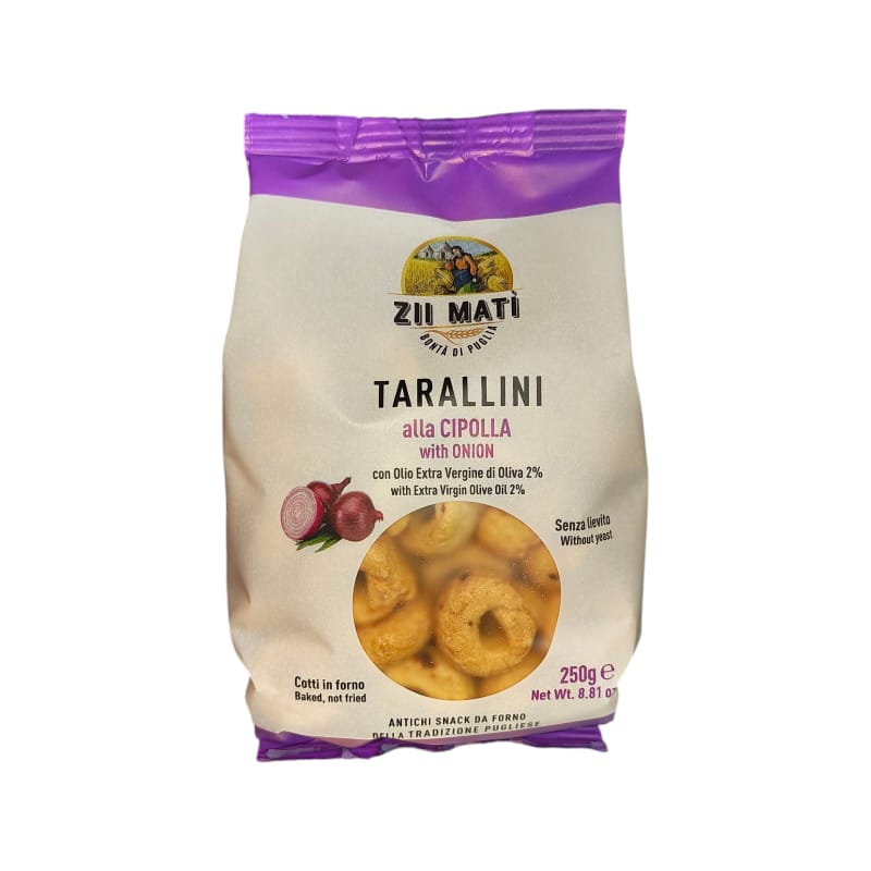 Tarallino alla cipolla realizzato con la ricetta tradizionale, senza lievito e olio di palma.